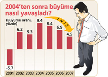 Geçen yıl Türkiye’nin milli geliri 658.8 milyar dolara ulaştı ancak yüzde 5’lik büyüme hedefi tutmadı. Tarımdaki küçülmenin, inşaattaki sert frenin damgasını vurduğu 2007’de büyüme yüzde 4.5’te kaldı. Türkiye 2007’de yüzde 4.5 büyüme hızıyla yüzde 5’lik hedefin 0.5 puan altında kaldı. Böylece 2001’den sonra en düşük büyüme performansı sağlanırken, Türkiye’nin milli geliri 658.8 milyar dolar, kişi başına milli gelir rakamı ise 9 bin 333 dolar oldu.