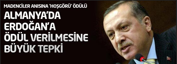 Almanya’da Başbakan Erdoğan’a madenciler anısına “hoşgörü ve tolerans” ödülü verilecek olmasına başta Alevi dernekleri olmak üzere birçok demokratik sivil toplum kuruluşu tepki gösterdi. Ödül günü büyük bir protesto eylemi düzenlenecek. Almanya’nın Kuzey Ren Vestfalya eyaletinde Ruhr bölgesinde maden ocaklarında çalışanların anısına verilen “Steiger Ödülü”nün Başbakan Erdoğan’a verilecek olmasına başta Alevi dernekleri olmak üzere demokratik sivil toplum kuruluşları ve bazı Türk kökenli milletvekilleri tepki gösterdi. Yarın Bochum kentinde düzenlenecek ve Erdoğan’ın da katılacağı Bochum kentinde büyük bir protesto mitingi yapılacağı belirtildi.