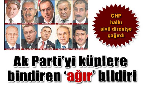 CHP’li on milletvekili yüksek yargıda yapılacak değişikliklere tepki olarak yayımladıkları bildiride halkı meşru direnişe çağırdı CHP’li Anayasa ve Adalet Komisyonu’na üye milletvekilleri, dün yayımladıkları bildiri ile Anayasa Mahkemesi’nin yeniden yapılandırılması ve Yargıtay ve Danıştay’a yeni daireler kurulmasını öngören yasa tasarılarını Hitler dönemi Nazi Almanya’sındaki gelişmelere benzeterek, toplumun bütün kesimlerini direnişe çağırdı. Yüksek Mahkeme’nin Nazilerin “Halk Mahkemesi’ne” benzeyeceği savunulurken, CHP Konya Milletvekili Atilla Kart, “Bu yapı içinde, bütün unsurları, anayasal ve meşru zemin içinde direnmeye ve muhalefete çağırıyoruz. Söylediğimiz budur: Bunun yol ve yöntemleri, vurmadan kırmadan, meşru zeminlerde her zaman için demokrasilerde bulunur” dedi.