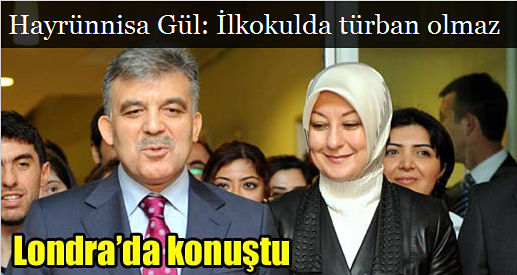 Cumhurbaşkanı Gül’ün eşi Hayrünnisa Gül, “ilkokulda türban” tartışmalarına son noktayı koydu, ailelere mesajı verdi… Cumhurbaşkanı Abdullah Gül’ün eşi Hayrünnisa Gül, eşi ile birlikte geldiği İngiltere’nin başkenti Londra’da üniversitelerde okuyan öğrenciler ve dernek üyeleri ile biraya geldi.
