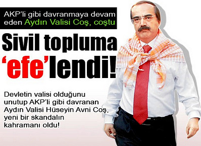 AKP’li gibi davranmaya devam eden Aydın Valisi Coş, coştu: Devletin valisi olduğunu unutup AKP’li gibi davranan Aydın Valisi Hüseyin Avni Coş, yeni bir skandalın kahramanı oldu! MHP afişini zorla indirten, resmi törenlere geç gelen, muhalefeti yok sayan, Aydın’ın CHP’li Belediye Başkanı Özlem Çerçioğlu’na ’soyulmuş patates’le gönderme yapan Coş, bu kez de sivil topluma garip mesajlar verdi.