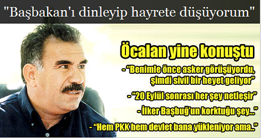 Abdullah Öcalan, İmralı’da kendisiyle gerçekleştirilen görüşmeleri açıklayarak, “Benimle görüşen heyet, sivil kişilerden oluşuyor. İlk dönemler benimle görüşenler askeri heyetti, şimdiki heyet sivil bir heyet. Bilemiyorum Hükümetin son açıklamalarına bakılırsa aniden kesilebilir de” dedi.
