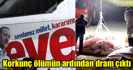 İstanbul’da rüzgardan yırtılan “Referanduma Evet” afişini değiştirmekle görevli işçi, yorgunluktan afişin altına girerek uyuyakalınca, vincin altında kalarak yaşamını yitirdi. İSTANBUL – Alınan bilgiye göre, Anayasa değişikliklerine ilişkin 12 Eylülde yapılacak referandum konusunda Yunus Mahallesi Ankara Caddesi’nde bulunan bir çimento deposuna asılan “Evet” pankartı aşırı rüzgar nedeniyle koptu.