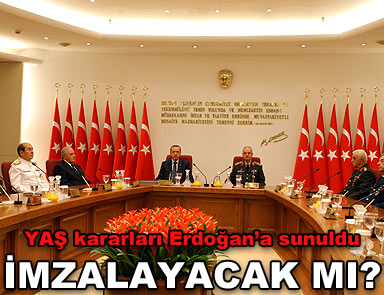 “Balyoz” davası gölgesinde gerçekleştirilen Yüksek Askeri Şura toplantısından nihayet karar çıktı. Zirve üstüne zirve ile geçen bir sürecin ardından Milli Savunma Bakanı Vecdi Gönül, YAŞ kararlarını Başbakan Recep Tayyip Erdoğan’a sundu.