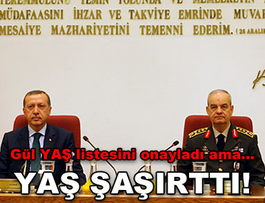 “Balyoz” davasının gölgesinde gerçekleştirilen Yüksek Askeri Şura toplantısından nihayet karar çıktı. Cumhurbaşkanı Abdullah Gül, YAŞ kararlarını onayladı. Sürpriz olarak nitelendirilen kararlara göre, Genelkurmay Başkanlığı ve Kara Kuvvetleri Komutanlığı’na atama yapılmadı. Atamaların yarın yapılması bekleniyor.