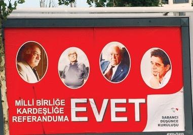 Ankara’nın en işlek bulvarlarından Eskişehir Yolu’ndaki bilbordlara dün bazı sanatçıların, işadamlarının ve Fethullah Gülen’in fotoğrafların yer aldığı afişler asıldı.Ancak, büyük puntolarla, “Milli birliğe,kardeşliğe, referanduma evet” sloganı yazan ve altında “Sabancı Düşünce Kuruluşu” ibaresi bulunan afişlere sahip çıkan olmadı. Sabancı Holding afişlerin şirket ve kurumlarıyla hiçbir ilgisi olmadığı açıkladı.