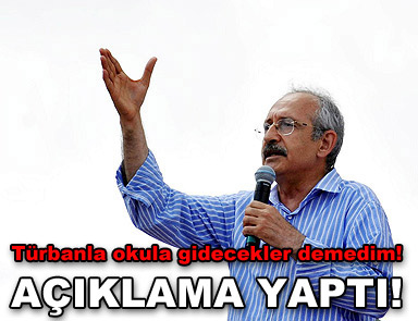 CHP Genel Başkanı Kemal Kılıçdaroğlu, “Kızlar üniversiteye türbanla gidecek demedim” dedi. CHP Genel Merkezi’nden yapılan açıklamaya göre, bir gazetede bugün “Kızlar üniversiteye türbanla gidecek” başlıklı röportajının yayımlandığını anımsatan Kılıçdaroğlu, “Gazetede ayrıntılı olarak yer alan sorular ve bu sorulara verilen yanıtlardan da açıkça görüleceği gibi tarafımdan ‘Kızlar üniversiteye türbanla gidecek’ ifadesi kullanılmamıştır” dedi.