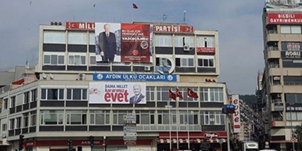 Aydın MHP İl Teşkilatı ve Ülkü Ocakları binasına Başbakan Binali Yıldırım’ın posteri asıldı. Başbakan Binali Yıldırım‘ın “MHP ile ortak ‘evet’ mitingi yapmamızda bir sakınca yok” açıklamasının ardından, Aydın MHP İl Teşkilatı ve Ülkü Ocakları binasına asılan Binali Yıldırım pankartı dikkat çekti.