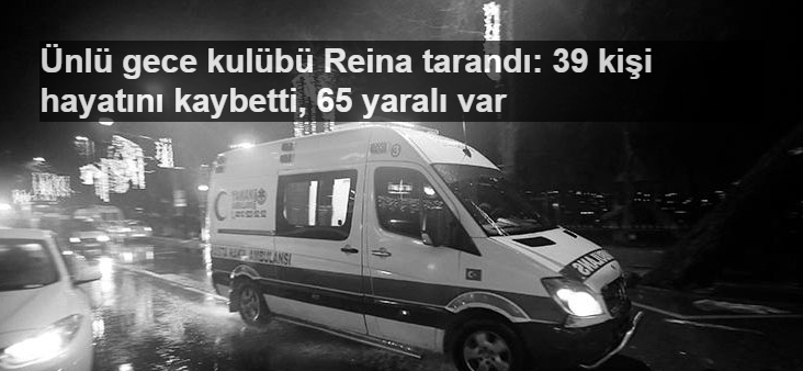 İstanbul’un Ortaköy semtindeki Reina isimli gece kulübüne düzenlenen silahlı saldırıda 39 kişi hayatını kaybetti, dördü ağır 65 kişi yaralandı. Yaralılardan biri, “Taradılar, sağ olan herkesin kafasına sıktılar” dedi. [dailymotion]http://www.dailymotion.com/video/x56zncn_gece-kulubu-reina-ya-silahli-saldiri_news[/dailymotion] Saldırı 01:15 sularında gerçekleşti. Saldırganın Reina’ya girişi güvenlik kamerasına yansıdı. [dailymotion]http://www.dailymotion.com/video/x56zsh0_170101045-teroristin-gece-kulubune-giris-ani-guvenlik-kamerasinda_news[/dailymotion] Gece kulübünde o sırada 700-800 kişi bulunuyordu. Bazı tanıklar Arapça bağırışlar duyduğunu söyledi.