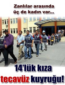 GAZİANTEP’te 14 yaşındaki H.Y.’yi fuhuşa zorladıkları ve ilişkiye girdikleri iddiasıyla 2’si kadın 20 kişi gözaltına alındı. Ahlak Büro Amirliği ekipleri, Hürriyet Mahallesi’ndeki bir evde küçük yaşta bir kıza tecavüz edilip, para karşılığı erkeklere pazarlandığı ihbarı üzerine harekete geçti. Polis yaptığı baskında, evde bulunan H.Y. ile küçük kızı fuhuşa zorladıkları ileri sürülen 2’si kadın 5 kişiyi gözaltına aldı. Emniyet Müdürlüğü’ne götürülen H.Y. ve diğer zanlıların ifadeleri doğrultusunda 15 kişi daha gözaltına alındı. Bu kişilerden bazılarının H.Y. ile para karşılığında ilişkiye girdiği ileri sürüldü. 20 zanlı sorgulamalarının ardından, ‘küçük yaştaki kız çocuğuna cinsel istismarda bulunmak’, ‘zorla fuhşa teşvik ve aracılık etmek’, ‘fuhuş için yer temin etmek’ ve ‘küçük yaştaki kızla birlikte olmak’ suçlamasıyla adliyeye sevk edildi. Kaynak : Milliyet Gazetesi