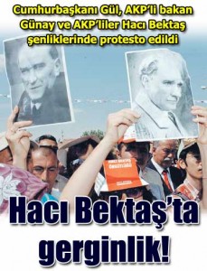 Cumhurbaşkanı Abdullah Gül ile Kültür ve Turizm Bakanı Ertuğrul Günay, Hacıbektaş Veli şenliğinde ellerinde Atatürk fotoğrafları taşıyan bir grup tarafından protesto edildi. Protestocular, ‘Burada Cumhurbaşkanı istemiyoruz’ pankartı açtı. Hacıbektaş Veli şenliğinde, Cumhurbaşkanı Abdullah Gül ile Kültür ve Turizm Bakanı Ertuğrul Günay protesto edildi.