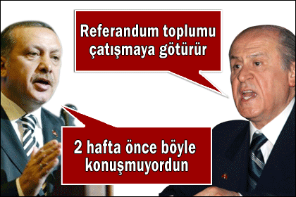 Başbakan Erdoğan, Bahçeli’nin kendisine yönelik yaptığı açıklamalara Bosna Hersek’ten jet hızıyla yanıt verdi. Bahçeli, Anayasa değişikliğini referanduma götürmenin toplumda çatışmaya yol açacağın söyledi, Erdoğan isyan etti: İki hafta önce böyle konuşmuyordun… MHP Genel Başkanı Devlet Bahçeli, gruptaki konuşmasında Erdoğan’a yönelik açıklamalarda bulunmuştu. Başbakan’ın gerilimden medet umduğunu ve çeteler konusunda bildiklerini açıklamasını istediğini söyleyen Bahçeli’ye Başbakan, Bosna-Hersek’ten anında yanıt verdi.