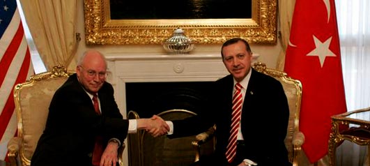 Cheney, “İran ve Suriye ile ilişkinizi anlamakta zorlanıyoruz” dedi. Erdoğan, “İlişkimiz iyi olmazsa doğru mesajı kim verecek” yanıtını verdi.. ABD Başkan Yardımcısı Dick Cheney’nin Ankara ziyaretinde gündemde PKK ve Irak’ın geleceği kadar İran tehdidi de ağırlıklı olarak yer aldı. İran’ın bölgede giderek güçlendiğini söyleyen ve İran’ın nükleer silah üretmesi halinde Türkiye’ye de tehdit oluşturacağını belirten Cheney, Ankara-Tahran arasındaki yakınlaşmadan duyulan rahatsızlığı da vurguladı. İran’ın bölge istikrarına ve dünyaya tehdit oluşturduğunu söyleyen Cheney, uranyum zenginleştirme programına devam eden İran’ın Türkiye için tehdit haline geleceğini vurguladı.