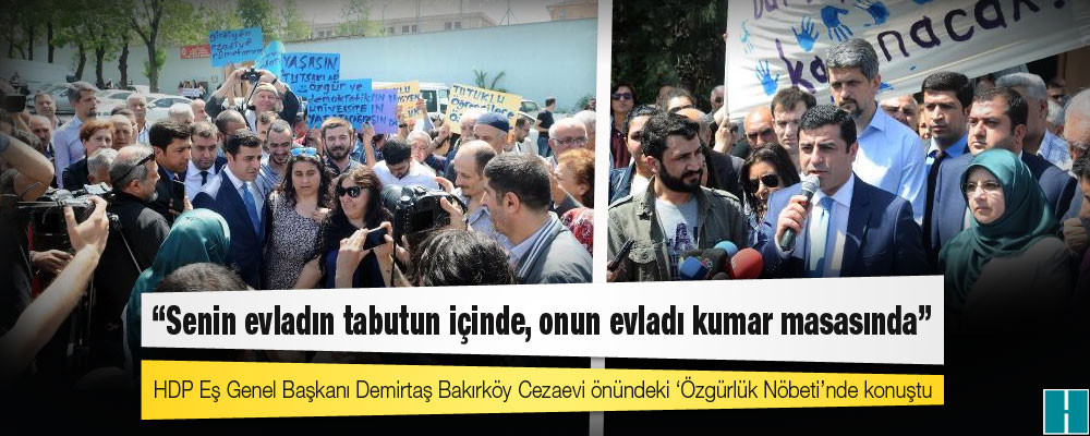 Demirtaş, HDP Milletvekilleri Garo Paylan ve Hüda Kaya ile birlikte ‘Bu suça ortak olmayacağız’ başlıklı bildiriyi imzaladıkları için tutuklanan akademisyenler Esra Mungan ve Meral Camcı’ya destek olmak amacıyla tutulan ‘özgürlük nöbeti’nde konuştu. HDP lideri, Yıldırım üzerinden gazetecilere, “İki gün önce bir bakanın oğlunun nerede kumar oynadığı haberleştirildi. Fakat benim olmayan oğlum, Amerika’da özel kolejlerde okuyor diye haber yapan gazeteciler nerede? Benim ailemden biri Singapur’da kumar masasında görüntülenseydi, neler yaşanırdı biliyorsunuz” diye seslendi.