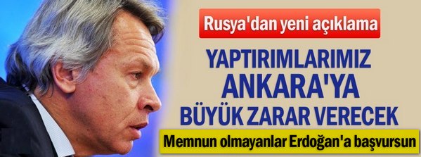 Rus uçağının düşürülmesine misilleme olarak Rusya Yönetimince uygulanacak yaptırımların Ankara için “ciddi sonuçlarının olacağı” öne sürüldü. Yaptırımlar için “orantılı” ifadesini kullanan Duma Dışişleri Komitesi Başkanı Aleksey Puşkov, “Türkiye’de bu durumdan memnun olmayanları Erdoğan’a başvurmaya çağırıyoruz” şeklinde konuştu.