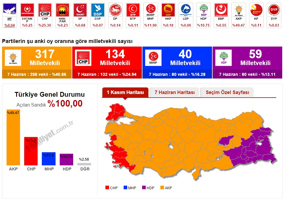 Değerli arkadaşlar sandıktan çıkan sonuç malum, bu koalisyon görüşmeleri sonuç vermeyince tekrar milli iradeye gitmek durumundaydık ve milli iradeye müracaat ettik. Ve milli irade dün 1 Kasım itibari ile istikrardan yana tecelli etti. Ben şu an da çıkan neticenin ülkemiz için hayırlara vesile olmasını niyaz ediyorum. Bir olalım diri olayım hep birlikte Türkiye olalım.