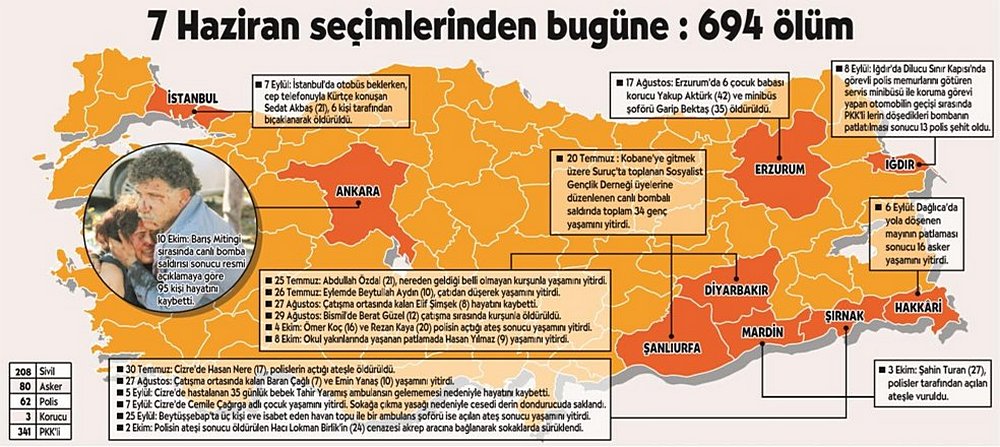 HDP’nin barajı aşacağı kesinleşince, seçimlere iki gün kala bugünkü tablonun ilk katliamı yaşandı. Seçimlerin ardından barış süreci buzdolabına konuldu, PKK ile savaş yeniden başladı.
