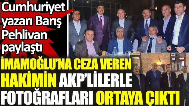 İmamoğlu’na verilen cezalar büyük tepki çekerken, Barış Pehlivan, davanın hakiminin AKP’lilerle fotoğraflarını ortaya çıkardı. İstanbul Büyükşehir Belediye (İBB) Başkanı Ekrem İmamoğlu için mahkemeden bugün verilen 2 yıl 7 ay 15 gün hapis ve siyasi yasak cezası kararı veren hakimin AKP’li yöneticiler ve eski İBB Başkanı Kadir Topbaş ile fotoğrafları ortaya çıktı. Gazeteci Barış Pehlivan, İmamoğlu’na hapis cezası ve siyasi yasak kararı veren hakim Mehdi Komşul’un fotoğraflarını ve Twitter hesabını sosyal medyadan paylaştı.