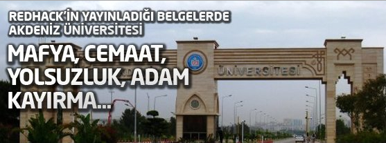 Redhack’ın geçtiğimiz hafta yayınladığı Akdeniz Üniversitesi belgelerinde, yolsuzluk, mafya, cemaat ve üst düzey yöneticilere yönelik iddialar dikkat çekiyor. Belgelerin arasında CHP Milletvekili İlhan Cihaner’in bir süre önce meclise taşıdığı yolsuzluk iddialarına ait belgeler de bulunuyor. Redhack’in YÖK’ten ele geçirdiği gizli belgelerdeki iddialar üniversiteleri sarsmaya devam ediyor. Redhack’ın geçtiğimiz hafta yayınladığı Akdeniz Üniversitesi’ne ait belgelerin arasında, CHP Denizli Milletvekili İlhan Cihaner’in geçtiğimiz ay bir gensoru önergesi hazırlayarak meclis gündemine taşıdığı yolsuzluk iddialarına ait belgeler de yer alıyor.
