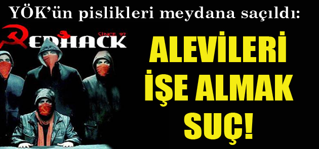 RedHack kapağı kaldırdı, YÖK’ün pislikleri meydana saçıldı:‘Alevileri işe almak suç’ RedHack’in YÖK belgelerini yayınlamasının ardından Malatya Üniversitesi rektörü Prof. Dr. Fatih Hilmioğlu’na “annesi Alevi olduğu, Alevileri ve solcuları işe aldığı” gerekçesi ile soruşturma açıldığı ortaya çıktı. RedHack ele geçirdiği YÖK belgelerinden birini daha yayınladı. Ergenekon davasından tutuklanan Malatya Üniversitesi rektörü Prof. Dr. Fatih Hilmioğlu’na YÖK tarafından açılan soruşturmaya ilişkin düzenlenen belgede Hilmioğlu’na Alevileri işe aldığı gerekçesiyle soruşturma açıldığı ortaya çıktı.