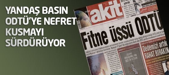 Yandaş basın ODTÜ’de Başbakan Erdoğan’ın protesto edilmesine tepkisini sürdürüyor. Yeni Akit gazetesi ODTÜ’yü “fitne üssü” ilan ederken, Star gazetesi bugün de öğrenci örgütlerini “terör örgütü” diye nitelemeyi sürdürdü. Başbakan Erdoğan’ın ODTÜ’de protesto edilmesi yandaş ve gerici basını harekete geçirdi. Günlerdir ODTÜ’lü öğrencileri hedef haline getiren Star gazetesi bugün yasal öğrenci örgütlerini “terör örgütü” ilan ederken, Yeni Akit hedef büyüterek ODTÜ için “fitne üssü” manşeti attı.