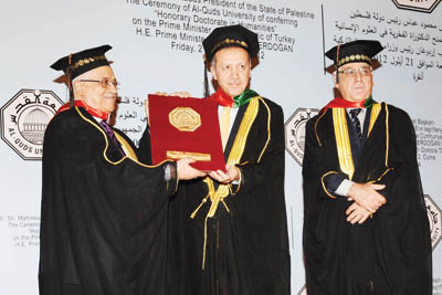Filistin El Kudüs Üniversitesi nin fahri doktora unvanı verdiği Erdoğan, Filistin Lideri Mahmut Abbas ın da (solda) katıldığı törende Şu anki İsrail yönetiminin Tevrat la alakası yoktur dedi Başbakan Erdoğan’ın bugünkü ABD ziyaretini Suriye konusunda beklentilerin karşılanmaması nedeniyle iptal ettiği belirtiliyor. Başbakan Recep Tayyip Erdoğan ’ın 67. Dönem BM Genel Kurulu çalışmalarına katılmak için bugün gideceği ABD ziyareti iptal edildi. Başbakanlık’tan yapılan resmi açıklamada iptal gerekçesi olarak AK Parti 4. Olağan Büyük Kongresi’yle ilgili çalışmalar ve program yoğunluğu gösterildi. Oysa, AK Parti ’nin kongresinin 30 Eylül’de yapılacağı aylar öncesinden netleşmişti. Kulislerde Suriye konusunda Türkiye ’nin taleplerinin karşılık bulmaması ve BM ’de Erdoğan’ın ABD Başkanı Barack Obama ile görüşmesinin olmamasının iptalde etkin olduğu yorumları yapılıyor.