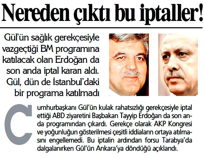 Gül’ün sağlık gerekçesiyle vazgeçtiği BM programına katılacak olan Erdoğan da son anda iptal kararı aldı. Gül, dün de İstanbul’daki bir programa katılmadı. Cumhurbaşkanı Gül’ün kulak rahatsızlığı gerekçesiyle iptal ettiği ABD ziyaretini Başbakan Tayyip Erdoğan da son anda programından çıkardı. Gerekçe olarak AKP Kongresi ve yoğunluğun gösterilmesi çeşitli iddiaların ortaya atılmasını engellemedi. Bu iptalin ardından forsu Tarabya’da dalgalanırken Gül’ün Ankara’ya döndüğü açıklandı.