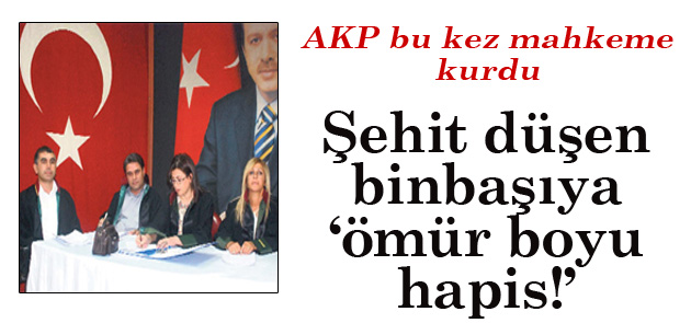 AKP Diyarbakır İl Başkanlığı, şehit düşen binbaşıya ‘ömür boyu hapis’ cezası verdi. Binbaşı Esat Yıldıran, İstanbul’da ailesinin gözü önünde şehit düştü. AKP ise o binbaşıyı temsili mahkeme kurup yargıladı. Geçmişin yaralarını kaşıyan AKP, dün yine “Bu kadar da olmaz” dedirten bir olaya imza attı… AKP Diyarbakır İl Başkanlığı binasında, sözde “Demokrasi Mahkemesi” kuruldu. Mahkemenin yapılacağı salon, Başbakan Erdoğan’ın dev posterleriyle donatıldı.