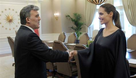 Türkiye’de Suriyeli sığınmacıların kaldığı kampları ziyaret eden Angelina Jolie, Cumhurbaşkanı Gül ile yaptığı görüşmede, ‘Türkiye’yi iyi bir örnek olarak her yerde anlatacağını’ söyledi. ANKARA – Hatay’daki Suriyeli sığınmacıları ziyaretinden sonra Ankara’ya geçen ünlü aktris Angelina Jolie, İçişleri Bakanı İdris Naim Şahin ve Başbakan Yardımcısı Beşir Atalay ile görüştükten sonra Cumhurbaşkanı Abdullah Gül ile bir araya geldi.