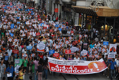 Taksim Meydanı’nda 4+4+4 eğitim sistemini protesto etmek amacıyla düzenlenen eyleme katılanlar, ‘Karanlığa bırakma eğitime sahip çık’ diye haykırdı. Halkevleri öncülüğünde gerçekleştirilen eyleme meslek örgütleri ve sendikalarla birlikte çok sayıda öğrenci velisi ve vatandaş da katıldı. Taksim Meydanı’nda 4+4+4 sistemine karşı çıkmak için toplanan kalabalık basın açıklamasını yapmak üzere sloganlar eşliğinde Galatasaray Lisesi önüne yürüdü. Eyleme katılanların, ‘5 yaş ilkokul değil anasınıfı’, ‘Çocuk gelinler istemiyoruz’, ‘ 4+4+4 kadın düşmanıdır’, ‘Kalabalık sınıflara hayır’, ‘Çocuklara işçilere hayır’, ‘Okullarımız ticarethane olmayacak’ yazılı dövizler taşıdığı görüldü. ‘ 4+4+4 ’ü durduracağız’, ‘Eğitim haktır satılamaz’ gibi sloganların atıldığı eylem Galatasaray Lisesi önünde yapılan basın açıklaması ve oturma eylemiyle devam etti.