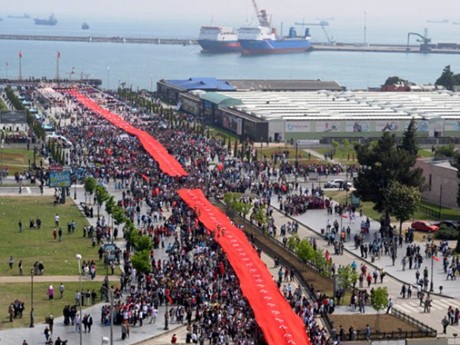 Mustafa Kemal Atatürk’ün Samsun’a çıkış tarihi olan 19 Mayıs’ın 93. yıl dönümü dolayısıyla yaptırılan 1919 metre uzunluğundaki dev türk bayrağı, 10 bini aşkın öğrenci ile yurttaşlarca Samsun sokaklarında gezdirildi. İstanbul- Ulu önder Atatürk’ün 18 silah arkadaşıyla 19 Mayıs 1919’da Samsun’a adım attığı Kurtuluş Yolu’ndan başlayan “Gençlik ve Bayrak Yürüyüşü”nde, 1919 metre uzunluğundaki Türk bayrağı 10 binden fazla öğrenci ile yurttaşlarca açılmaya başlandı. Dev bayrak, sokaklarda gezdirilerek Uğur Mumcu Parkı’na kadar açıldı.