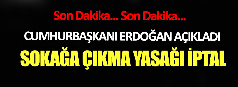 Cumhurbaşkanı Recep Tayyip Erdoğan, gece yarısı yayımlanan son dakika genelgesiyle getirilen sokağa çıkma yasağının iptal edildiğini açıkladı. Erdoğan, Twitter hesabından yaptığı paylaşımda, “Cumhurbaşkanı olarak 15 ilimizi kapsayan hafta sonu sokağa çıkma sınırlaması uygulamasını iptal etme kararı aldım. 2,5 ay aradan sonra yeniden günlük hayatını düzenlemeye başlayan vatandaşlarımızın sıkıntıya düşmesine gönlümüz razı olmadı” ifadesini kullandı.