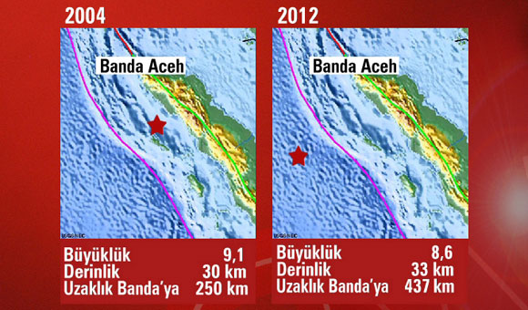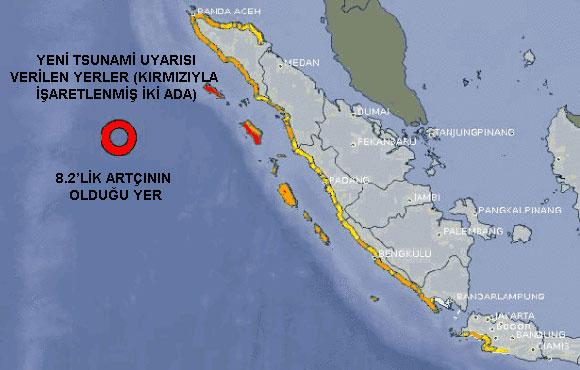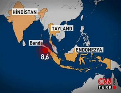Endonezya’nın Açe Adası açıklarında büyük bir deprem meydana geldi. İlk anda 8.9 olarak açıklanan depremin büyüklüğü önce 8.7’ye, sonra da 8.6’ya çekildi. Depremin ardından 8.2 ve 8.3 büyüklüğünde iki artçı şok kaydedildi. Depremin ardından ilk tsunami dalgaları güneydeki Nias adasına ulaştı.
