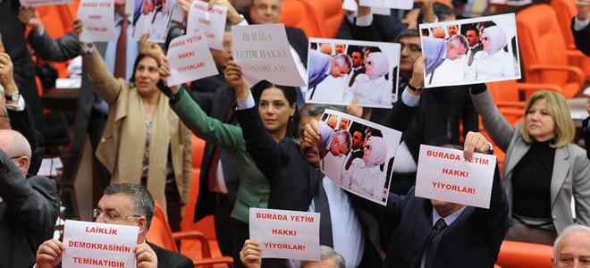 CHP’liler zorunlu eğitimi 12 yıla çıkaran teklifin görüşülmesinden önce Genel Kurul’u terketti. Zorunlu eğitimi kademeli olarak 12 yıla çıkaran kanun teklifi, TBMM Genel Kurulu’nda kabul edilerek yasalaştı. TBMM – TBMM Genel Kurulu’nda, CHP milletvekilleri dövizli eylem yaptı. Genel Kurul’da, zorunlu eğitimi kademeli olarak 12 yıla çıkaran teklifin 24. maddesinin görüşülmesine başlanmadan önce ayağa kalkan CHP milletvekilleri ellerinde, ”Yiyin efendiler yiyin”, ”Laiklik demokrasinin teminatıdır”, ”Burada yetim hakkı yiyorlar” yazılı dövizleri açarak, basın mensuplarına gösterdi. Bazı milletvekillerinin de AK Parti Adıyaman Milletvekili Mehmet Metiner ile Başbakan Recep Tayyip Erdoğan’ın eşi Emine Erdoğan’ın yer aldığı fotoğrafı ellerinde tuttuğu görüldü.