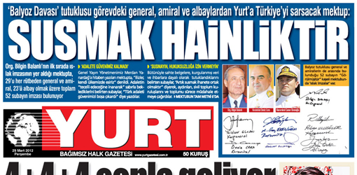 Susmak hainliktir. ‘Adalete inancımız sarsıldı’ Balyoz Davası tutuklusu muvazzaf general, amiral ve albayların gazetemize gönderdikleri ortak imzalı mektupta, iddianame “hukuk garabeti” olarak nitelendirildi. Susmanın ihanete ortak olmak anlamına geldiği belirtilerek; aydınlar, siyasetçiler, gazeteciler, bilim insanları ve sivil toplum kuruluşları sürece müdahale etmeye çağrıldı. ‘Bizi üzen düşmanların sözleri değil dostlarımızın sessizliği olmuştur’ dendi. Mektubun tam metnini aşağıda yayımlıyoruz.