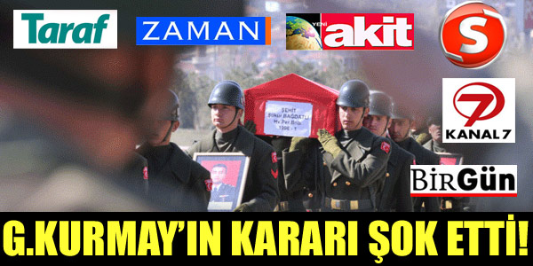 Afganistan’da şehit düşen 12 asker için Barış Gücü Tugay Komutanlığı’nda düzenlenen törende medyaya akreditasyon uygulandı. Afganistan’ın başkenti Kabil’deki helikopter kazasında şehit düşen 12 asker için Barış Gücü Tugay Komutanlığı’nda düzenlenen törene, Taraf, Zaman, Bugün, Yeni Akit ve Birgün gazetesi, Cihan Haber Ajansı, Samanyolu TV, Samanyolu Haber TV, Kanal 7, Bugün TV, Kanaltürk TV ve Ülke TV’nin muhabir, fotomuhabir ve kameramanları akreditasyonları yapılmadığı için tören alanına sokulmadı.
