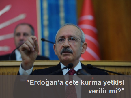 MİT Kanununda değişiklik öngören teklifin, Başbakan’a çete kurma yetkisi vereceğini iddia eden CHP Genel Başkanı Kemal Kılıçdaroğlu, “Başbakan çetesine şunu söyleyebilir; ‘Gidin Cumhurbaşkanını öldürün’, bu yasa çıkarsa bu imkanı var. ‘Gidin öldürün, nasılsa ben sizi görevlendirdim’ diyecek, özel görevle görevlendirdim diyecek” dedi.