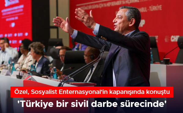 CHP Genel Başkanı Özgür Özel, Sosyalist Enternasyonal Konsey Toplantısı kapanış konuşmasında İBB’yi hedef alan operasyon ve İBB Başkanı Ekrem İmamoğlu’nun tutukluluğuna vurgu yaptı. Özel, “Buradan Avrupa’daki bütün yoldaşlarımın gözünün içine baka baka söylüyorum ki Türkiye bir sivil darbe sürecindedir” dedi.