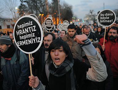 AGOS gazetesi önünde buluşan Dink ailesi ve Hrant’ın arkadaşları mahkemenin kararlarına tepki göstererek ”Biz bitti demeden, bitmeyecek” sloganları attı. Duruşmanın ardından açıklama yapan Dink ailesinin avukatı ise “Üç-beş kendini bilmez öldürmüş” diyerek karara tepki gösterdi. İstanbul- Hrant Dink’in ailesi, yakınları ve arkadaşlarından oluşan bir grup, 14. Ağır Ceza Mahkemesinin aldığı kararı protesto etti.