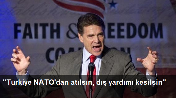 ABD’de Cumhuriyetçi Parti’nin bu yıl yapılacak başkanlık seçimleri aday adaylarından Teksas Valisi Rick Perry, Türkiye’nin NATO’dan atılması gerektiğini savundu. Perry, Cumhuriyetçi başkan adayını belirleyecek eyalet ön seçimlerinin üçüncü ayağı olan Güney Carolina’da seçim öncesi yapılan ve Fox News haber kanalından canlı yayınlanan münazarada, Türkiye hakkında çok ağır sözler sarf etti.