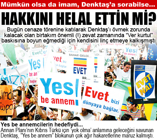 Mümkün olsa da imam, Denktaş’a sorabilse… Bugün cenaze törenine katılarak Denktaş’ı övmek zorunda kalacak olan birtakım önemli (!) zevat zamanında “Ver kurtul” baskısına boyun eğmediği için kendisini linç etmeye kalkışmıştı. Şimdi gözyaşı dökecekler Bugün toprağa verilecek olan KKTC Kurucu Cumhurbaşkanı Rauf Denktaş, 2002-2006 arası Annan Planı’na karşı çıktığı için “Yes be annem” cilerin boy hedefi haline gelmişti. Bölücülerden yandaş basına dek, herkes ona saldırmıştı.