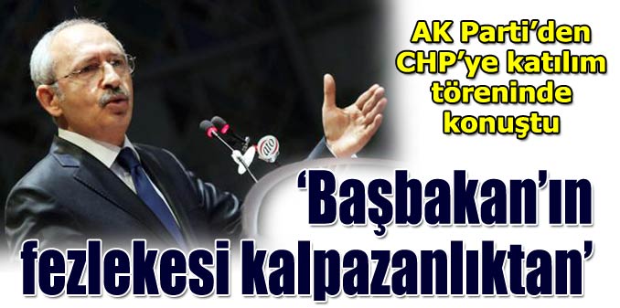 AK Parti’den CHP’ye katılımlar için düzenlenen törende konuşan Kemal Kılıçdarolu, Erdoğan’a çok sert sözlerle yüklendi. Kılıçdaroğlu, “Bizde kalpazanlık yok. Otobüs biletlerinde sahtecilik yok. Bizim senin gibi adi suçlardan dolayı fezlekemiz yok” diye konuştu. CHP Genel Başkanı Kemal Kılıçdaroğlu, Başbakan Recep Tayyip Erdoğan hakkında da belediye başkanlığı dönemiyle ilgili fezleke bulunduğunu belirterek, “Bizde kalpazanlık yok. Otobüs biletlerinde sahtecilik yok… Bizim senin gibi adi suçlardan dolayı fezlekemiz yok” dedi.