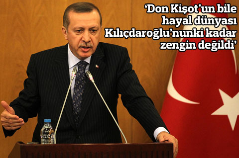 3. Enerji Verimliliği konferasında konuşan Başbakan Recep Tayyip Erdoğan, CHP lideri Kemal Kılıçdaroğlu’nun, hakkında verilen fezlekeye gösterdiği tepkileri eleştirerek ‘Don Kişot’un bile hayal dünyası bu kadar zengin değildi’ dedi. İSTANBUL – Başbakan konuşmasında fezleke tartışmalarına değinerek, CHP Genel Başkanı Kemal Kılıçdaroğlu’na sert eleştirilerde bulundu. CHP’nin Kılıçdaroğlu hakkında düzenlenen fezlekenin ardından kıyameti kopardığını söyleyen Erdoğan, ” Aslında dert başka, kendi içindeki sıkıntıyı nasıl giderecek ona bakıyor” dedi.