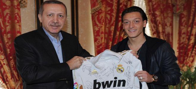 Başbakan Erdoğan, futbolcu Mesut Özil’i kabulünde bilmeden ‘’Kumar sitesi reklamı’’ yaptı. Erdoğan’a hediye edilen Real Madrid forması üzerinde, kumar ve bahis sitesi BWİN reklamı vardı. ANKARA – Başbakan Recep Tayyip Erdoğan, Real Madrid’in Türk asıllı ünlü futbolcusu Mesut Özil’i kabulünde bilmeden ‘’Kumar sitesi reklamı’’ yaptı.