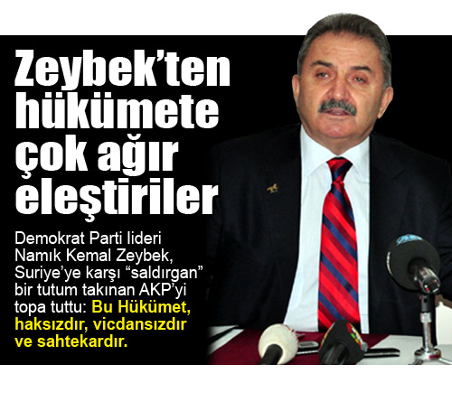 Demokrat Parti lideri Namık Kemal Zeybek, Suriye’ye karşı “saldırgan” bir tutum takınan AKP’yi topa tuttu: Bu Hükümet, haksızdır, vicdansızdır ve sahtekardır. Yalan söyleniyor, toplum kandırılmak isteniyor. İktidarı istifaya ya da akıllarını başlarına almaya davet ediyorum!
