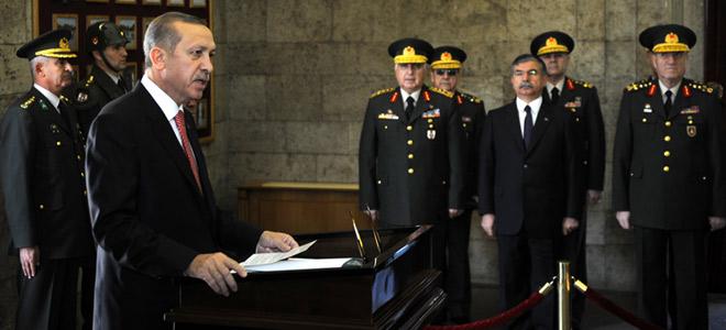 Yüksek Askeri Şura, Başbakan Erdoğan başkanlığında toplandı ve iç güvenlik ile Türk Silahlı Kuvvetleri’nin harbe hazırlık durumunu ele aldı. ANKARA- Başbakan Erdoğan, Aslanlı Yol’un başında komutanlar tarafından karşılandı. Şura üyeleri, Başbakan Erdoğan’ın başkanlığında, üzerinde ”YAŞ üyeleri” yazan kırmızı ve beyaz karanfillerden oluşan çelenk eşliğinde, Aslanlı Yol’dan yürüdü. Erdoğan’ın, Atatürk’ün mozolesine çelenk bırakmasının ardından saygı duruşunda bulunuldu. Daha sonra Erdoğan başkanlığındaki heyet, Misak-ı Milli Kulesi’ne geçti. Burada Anıtkabir özel defterini imzalayan Erdoğan, deftere yazdıklarını yüksek sesle okudu.