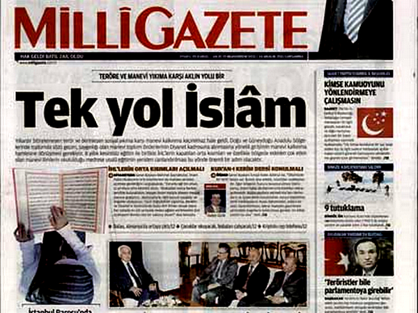 Milli Gazete dün şeriat talebiyle yayınlandı. 1000 kadar mollanın Diyanet’te istihdam edileceği haberlerinden heyecana kapıldığı anlaşılan gazete, manşetine “Tek Yol İslam” sloganını taşıdı. ‘MEDRESELER AÇILSIN’ Kapağında, Şuurlu Öğretmenler Derneği (ÖĞDER) ve Diyanet-Sen’in açıklamalarına da yer veren Milli Görüş çizgisindeki İslamcı gazete, imam hatip liselerinin kapatılan orta kısımlarının yeniden açılmasını, cumhuriyetin ilanıyla kapatılan medreselerin yeniden hayata geçirilmesini ve okullara Kuran ve İslam derslerinin konulmasını talep etti.