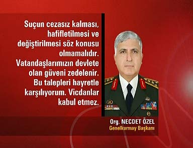 Genelkurmay Başkanı Org. Necdet Özel, Abdullah Öcalan’a yönelik ev hapsi taleplerine tepki göstererek, “Suçun cezasız kalması, hafifletilmesi ve değiştirilmesi söz konusu olmamalıdır. Vatandaşlarımızın devlete olan güveni zedelenir. Bu talepleri hayretle karşılıyorum. Türk kamuoyu ve vicdanlar bunu kabul etmez” dedi.