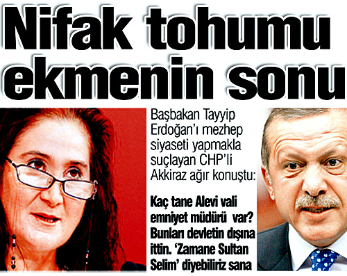 Başbakan Tayyip Erdoğan’ı mezhep siyaseti yapmakla suçlayan CHP’li Akkiraz ağır konuştu: Kaç tane Alevi vali emniyet müdürü var? Bunları devletin dışına ittin. ‘Zamane Sultan Selim’ diyebiliriz sana. İlk basın toplantısı TBMM’de basın toplantısı düzenleyen CHP Milletvekili Sabahat Akkiraz, Dersim üzerinden Erdoğan’a yüklendi.