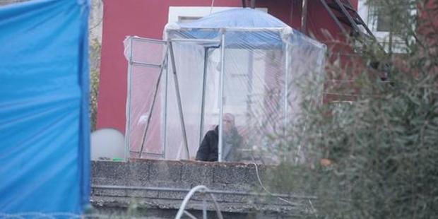 Evin çevresi mavi branda ile kapatılmış durumda.